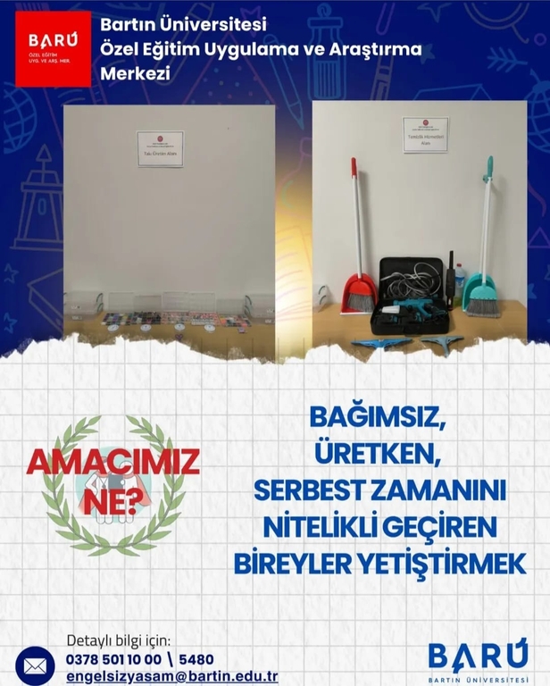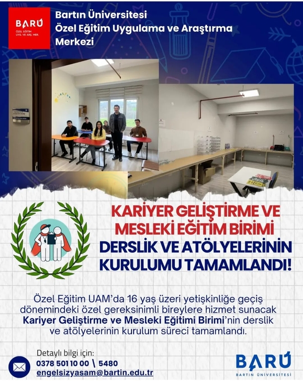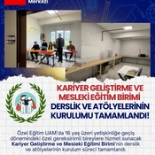 Özel Eğitim UAM'da 16 yaş ve üzeri yetişkinliğe geçiş dönemindeki özel gereksinimli bireylere hizmet sunacak Kariyer Geliştirme ve Mesleki Eğitim Birimi'nin derslik ve atölyeleri tamamlandı. Birimimizde özel gereksinimli bireylere Kariyer ve Mesleki Değerlendirme, Kariyer Eğitimi, Mesleki Eğitim, Serbest Zaman Eğitimi E- KPSS Hazırlık Programı, Kapsayıcı Afet Eğitimi, Engelsiz Üniversite Sembolik Lisans Programı alanlarında kapsamlı ve yaygın destekler sunularak yetişkinlik yaşamına bağımsız, üretken bir adım atmaları desteklenmektedir.Türkiye'de üniversiteler bünyesinde yetişkin özel gereksinimli bireylere sunulan hizmetler açısından ilkler arasında yer alan birimimizin kurulma sürecinde bizlere sundukları vizyon, rehberlik ve destekleriyle her zaman yanımızda olan Rektörümüz Prof. Dr. Sn. Ahmet AKKAYA'ya ve üniversitemiz birimlerine teşekkürlerimizi iletiyoruz.